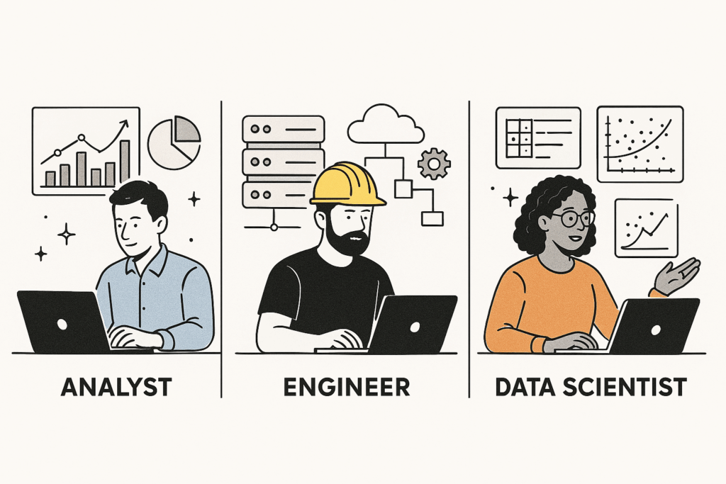 Você já se sentiu perdido nas profissões de dados? Analista, Engenheiro, Cientista… os termos são frequentemente usados como sinônimos, mas, na prática, representam funções distintas, com habilidades e focos muito diferentes. Entender essa diferença é o primeiro passo para construir uma carreira de sucesso na área que é considerada o “novo petróleo” da economia.