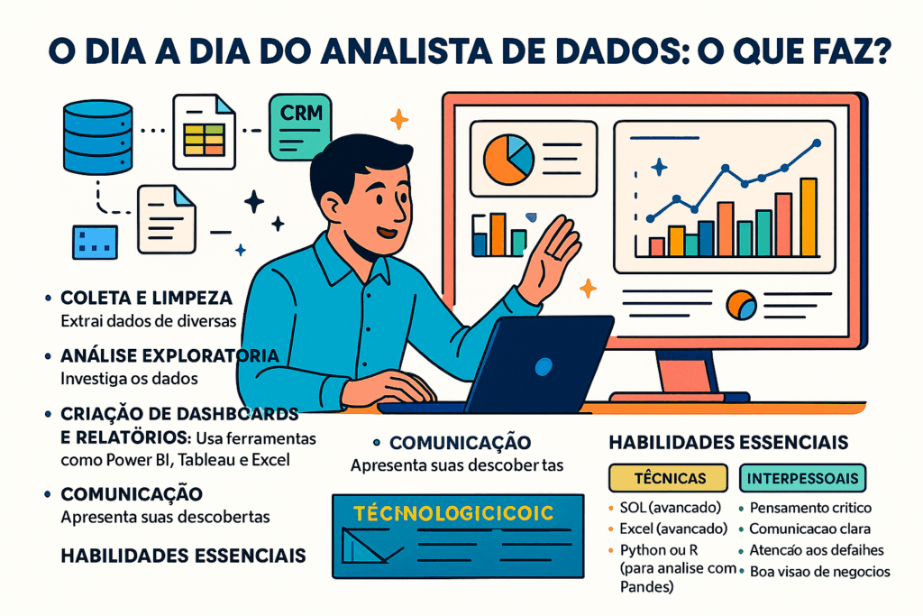 - Criação de Dashboards e Relatórios: Usa ferramentas como Power BI, Tableau e Excel para criar visualizações interativas que comunicam os resultados de forma clara para os gestores.