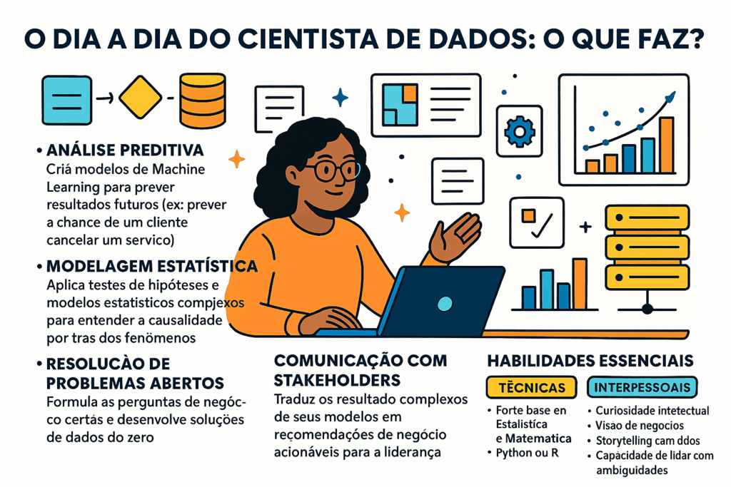 O cientista de dados é um profissional multidisciplinar que vai além da análise descritiva, utilizando métodos estatísticos avançados e Machine Learning para prever o futuro e prescrever ações.